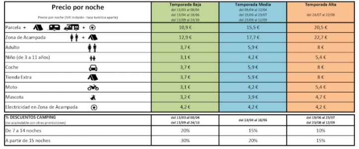 Te recomendamos que visites su página web www.campinglacorona.com y así verás la tabla de precios actualizada. También te puedes poner en contacto con ellos a través del teléfono 977 35 10 30 todos los días de 8:00 a 21:00 ,aunque si lo prefieres les puedes mandar un mail a info@campinglacorona.com