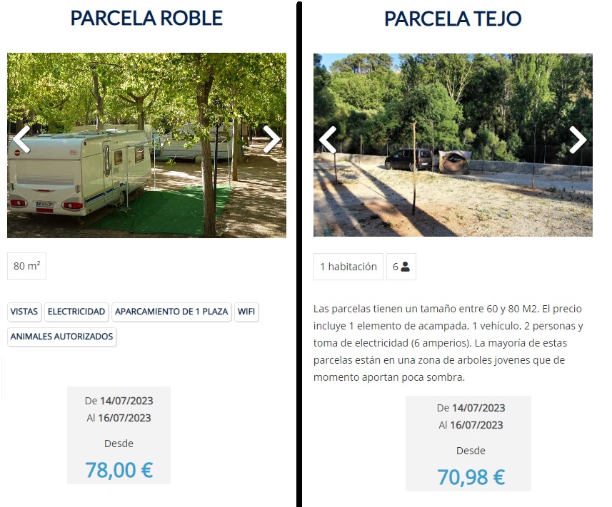 El camping esta abierto entre Marzo y Octubre y las tarifas varían en función de la temporada y el tipo de parcela. Por eso os recomendamos que visitéis su web oficial www.campingriomundo.es donde podéis informaros de las tarifas y hacer reservas de un mínimo de 2 noches. Pero nosotros para que os hagáis una idea os mostramos un ejemplo de dos noches en Junio del 2023: