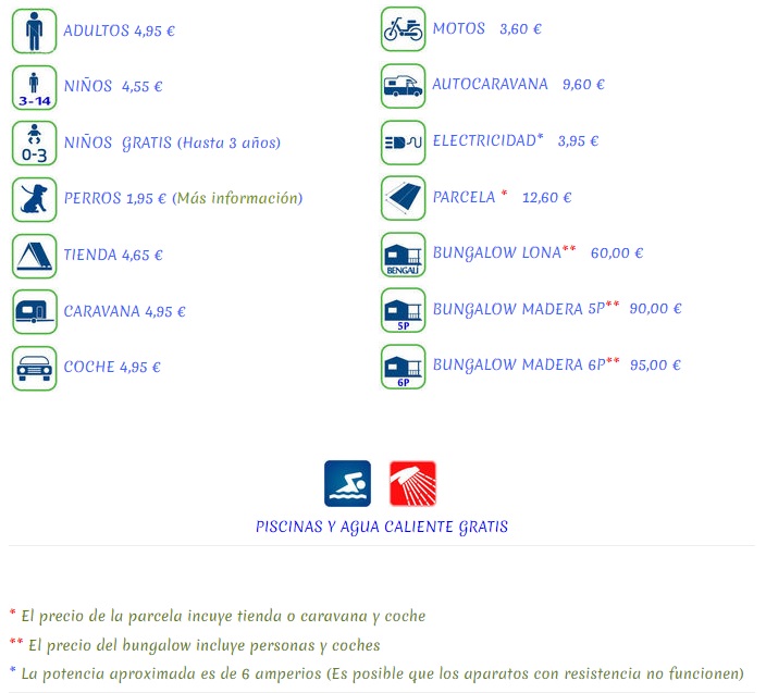 La zona de las piscinas está en la parte central del camping, dispone de una gran piscina principal y otra mas pequeña para los niños. Las piscinas están rodeadas por una amplia zona de césped para poder tumbarnos con nuestras toallas. Junto a las piscinas nos encontramos un parque infantil que hará las delicias de los mas pequeños, y merendero con barbacoas que harán las delicias de los mas grandes. Ademas el camping dispone de un bar restaurante con una apetecible terracita. Si no tenemos elemento de acampada propio , el camping dispone de dos tipos de cabañas de madera de 5 y 6 plazas, o si lo prefieres también disponen de unas tiendas de campaña fijas de lona, que te permiten disfrutar del camping sin necesidad de acarrear ni montar nuestra tienda, ideal para los que quieren probar por primera vez el mundo del camping. Este camping acepta perros incluso PPP, no estando permitida su entrada en la piscina ni bar. No especifica si están permitidos en las cabañas, pero en caso de dudas es mejor ponerse en contacto con el camping.